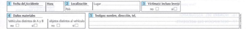 En el encabezado se rellenan los datos generales del accidente, fecha, lugar y posibles testigos de lo ocurrido, además de indicar si existen daños en otros vehículos o en objetos de la vía e indicar si existen víctimas con lesiones. En el recuadro de lugar, aunque no sea excesivamente grande, sería conveniente indicar la calle y número donde ha ocurrido el accidente, además del municipio.